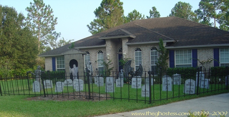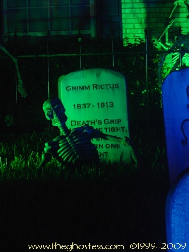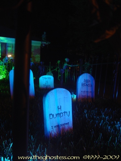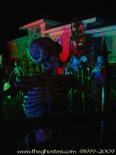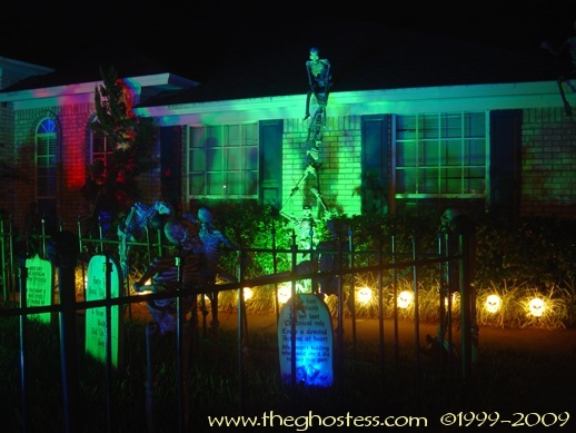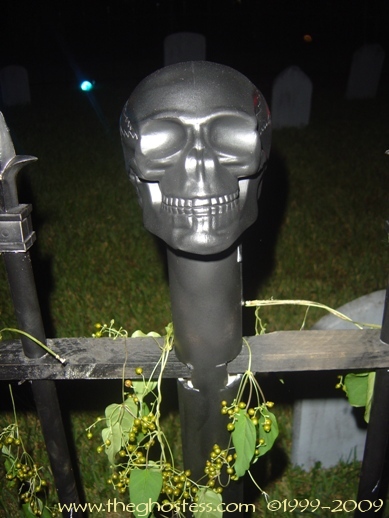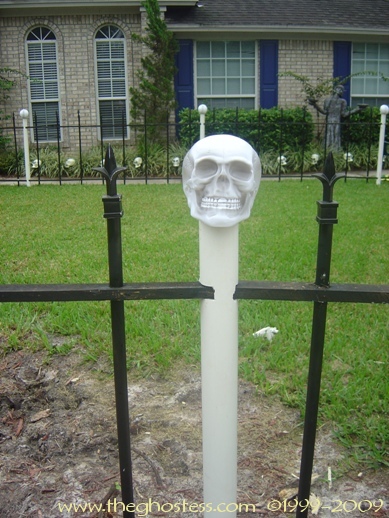 I made my cemetery fence using two different websites' plans. I made the fence originally in 2004 using Scott Messin's site. And for 2005, I added the posts ala Gory Corey: http://www.minionsweb.com/cemetery2.htm I also added some skulls from some of those Big Lots skull stake light sets since they were JUST the right size and didn't need any modifying. I used Gorilla Glue to attach them. |