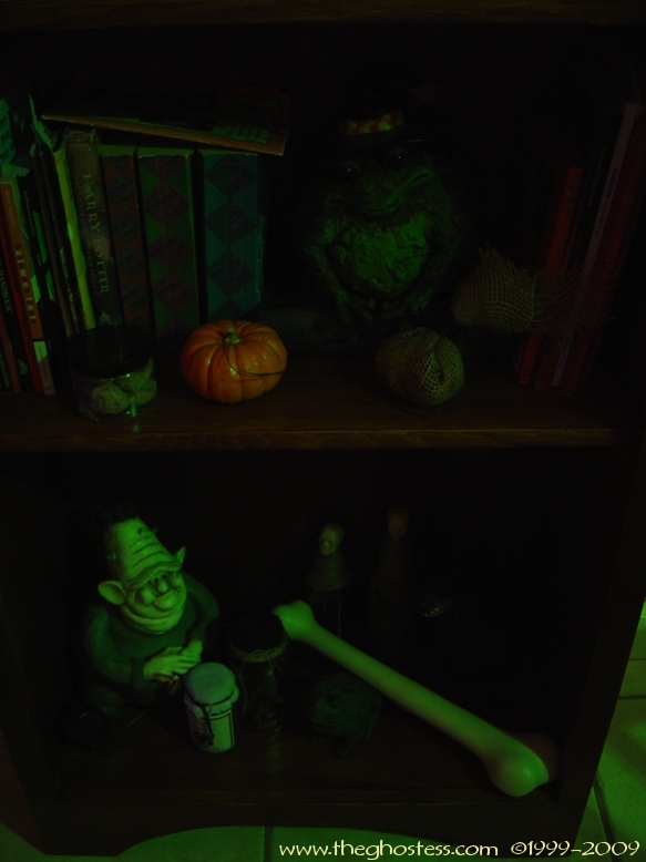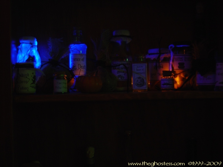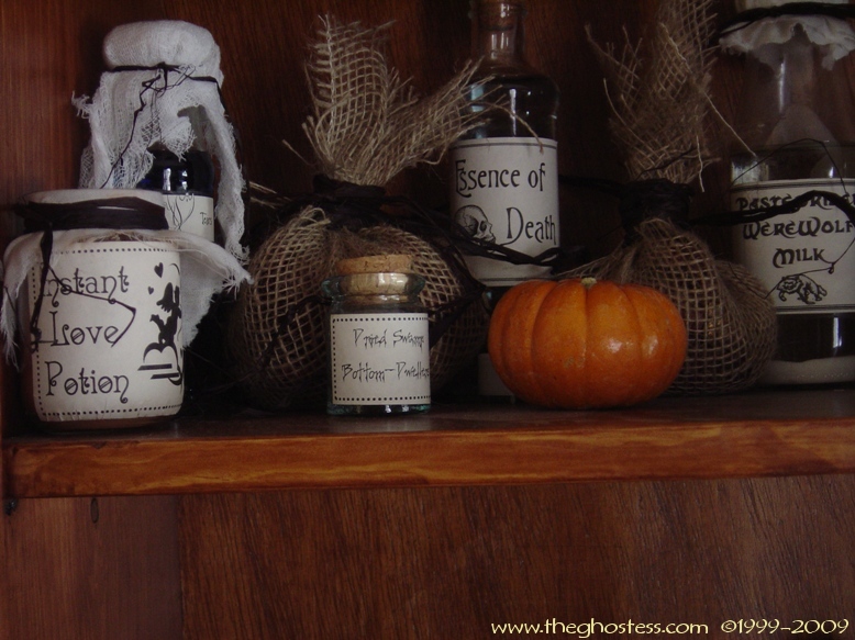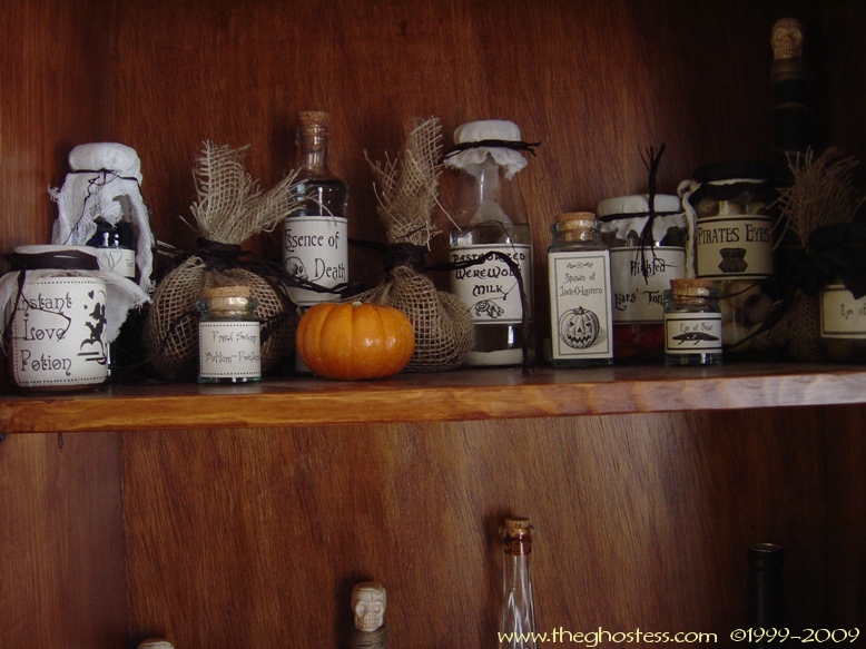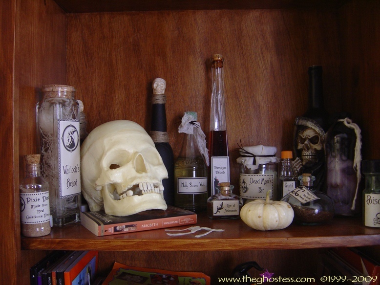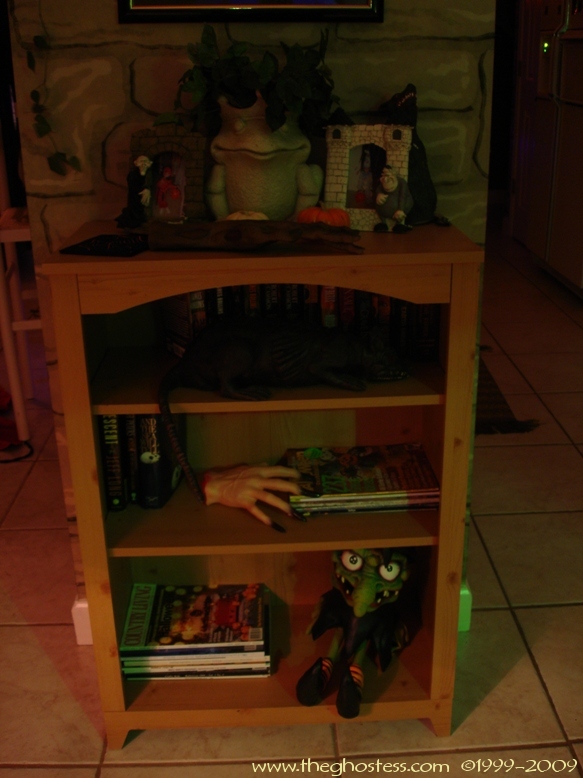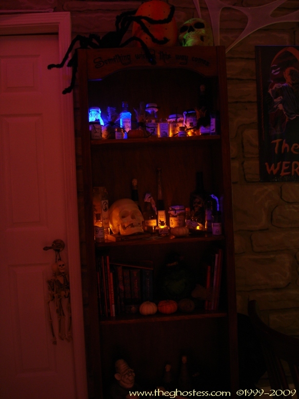From the kitchen, you head into the Nook. The "Something Wicked This Way Comes" Bookshelf I made is in there, along with all my witch potion ingredients. |