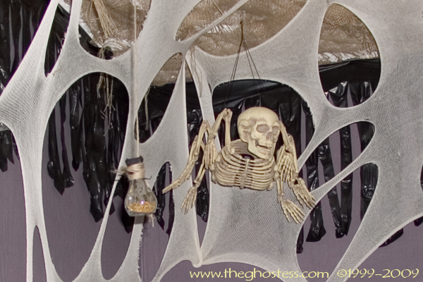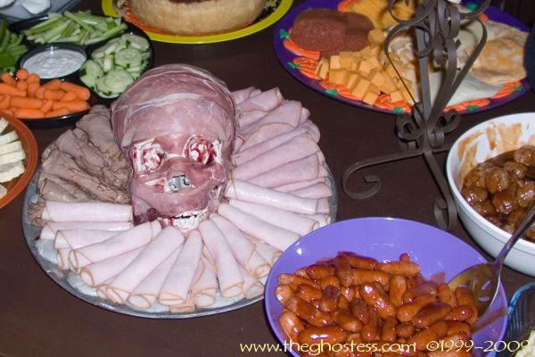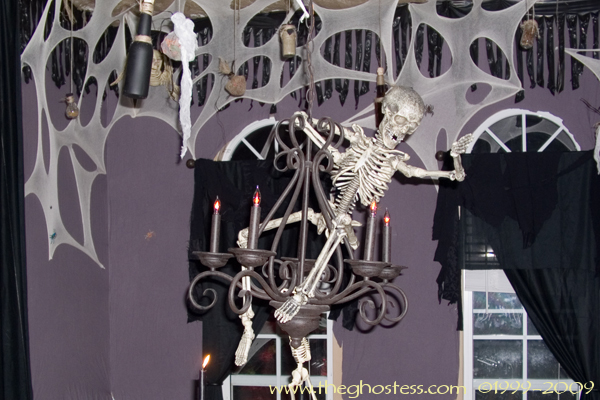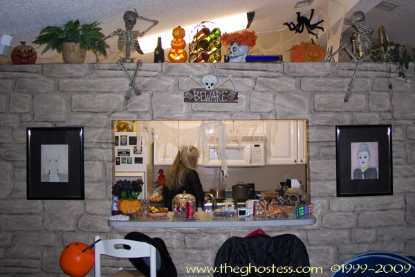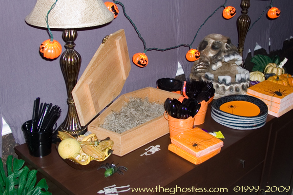 More stuff that didn't get done. I had plans for that open mini coffin and the big-mouth head there on the buffet. :( The mini pumpkins that I had the condiments in didn't get used because they weren't in the right spot.