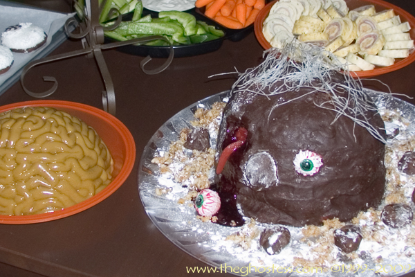 Ran out of time to properly decorate the Zombie Head cake this year. Last year's looked WAY better. But it tastes good! Everyone ate the face of it first. I still don't know what happened to one of the eyes.