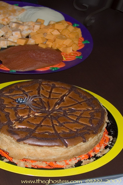 My baked cheese cake. I made some extra ganache and coated the crust before putting in the cheese mixture, and then piped some ganache across the top in a web design before baking. There was only one tiny slice left after the party. It was a dang good cake!