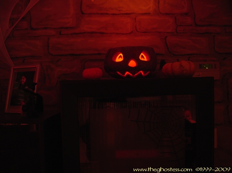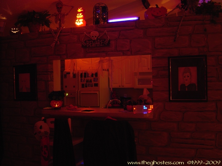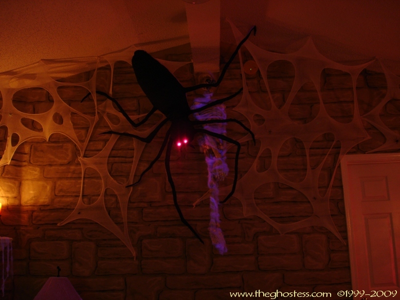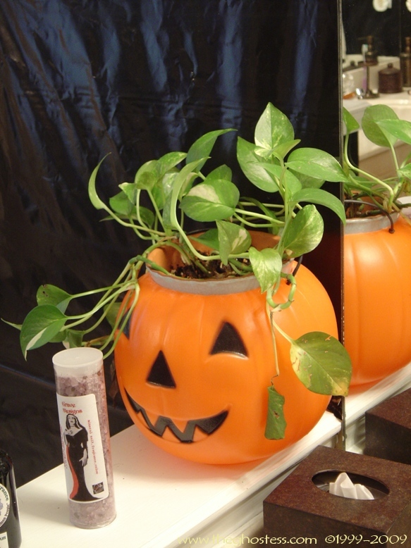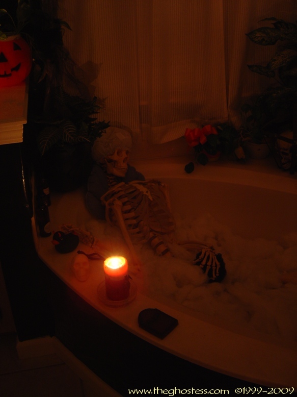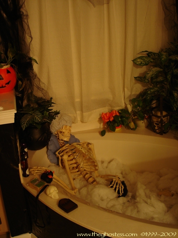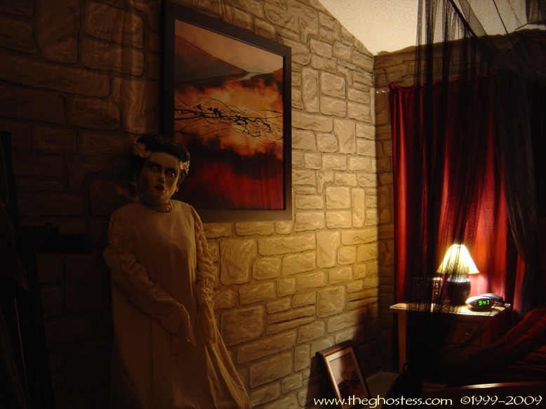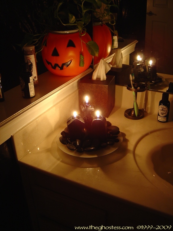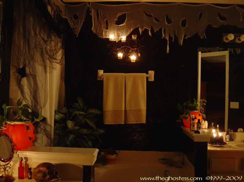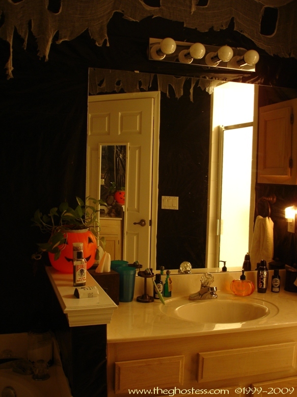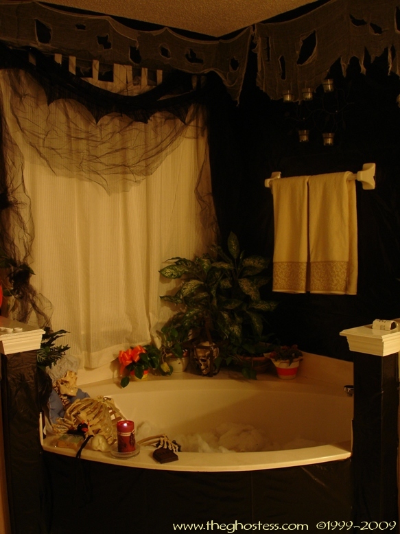 Off the family is the master bedroom which I turn into a gothic retreat for Halloween. It's the same basically as 2005, so I didn't take many pictures. The big framed print on the wall is actually one from our regular dining room decor. I hung it in our bedroom since the colors went with the red and black theme. The Bride hung around in here for the party and Halloween. I never got around to fixing her arms and hands, so I just leaned her up against the wall. I went further this year in the master bath room and covered the walls in black. This is one of the things that put me behind for the party since I suddenly decided to do it the Wednesday before the party. (OCD/impulsive AND a Gemini-- not a good combo!) |