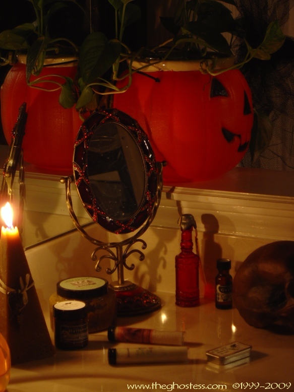 I even put my favorite magazines in the mag rack in the bathroom, like Haunt World and the assorted Halloween decor mags and Martha's Halloween issues. I also added 2 book posters from Laurell K. Hamilton's Anita Blake series. Some people call me "obsessed". I just call it "detail-oriented". A lot of people asked if I actually use the products in my bathroom or if they are just for decorations. YES, I do actually use them, but not often. I consider them a special treat to indulge myself with. The Goth Rosary products are my FAVORITE! The Crypt and GraveYard shampoos are to DIE for! I use my Absinthe lip balm every day. :) |
