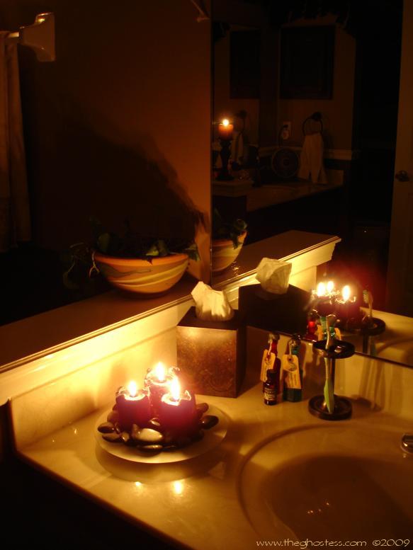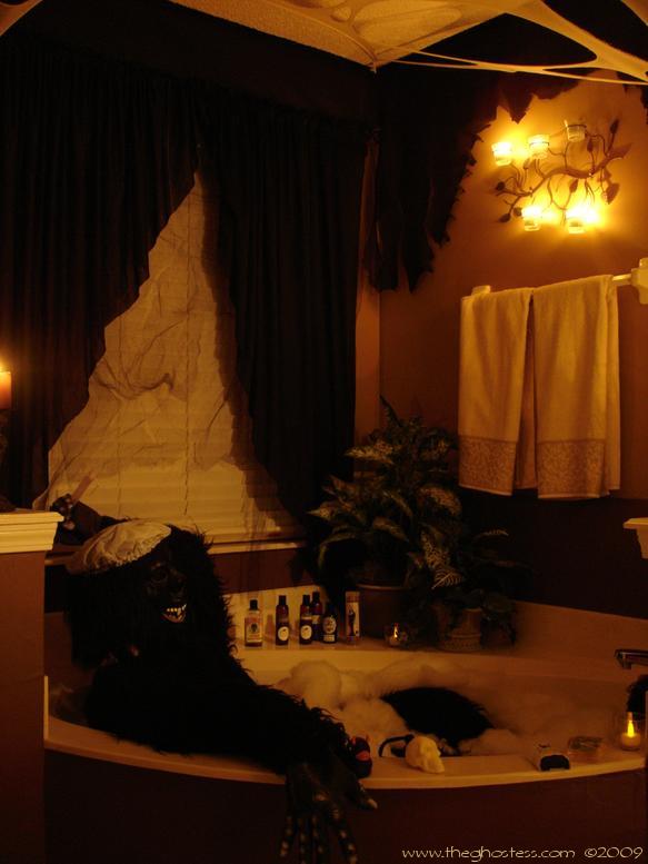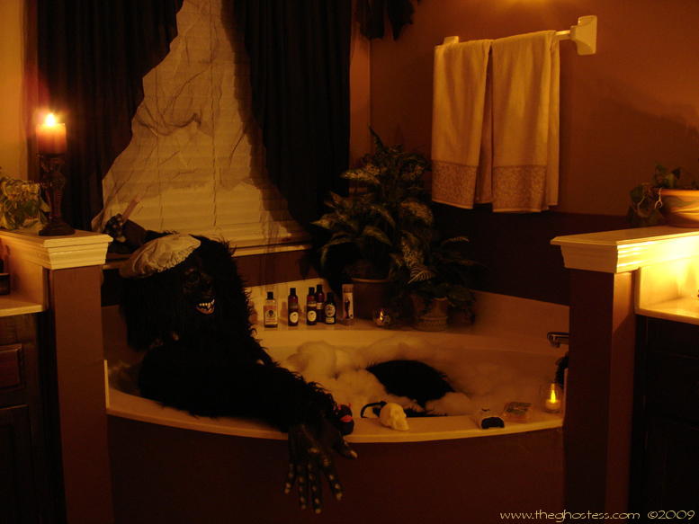 THE MASTER BATH ROOM Since I corpsed the Bucky that went in here in previous years, I decided to change it up some and use the Gorilla from the hall bath for my bathroom. I think he likes it better in there anyway. :) It was a big hit, especially with the kids who remembered the Bucky from years prior. |