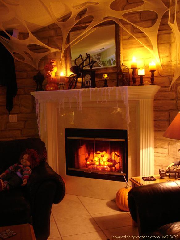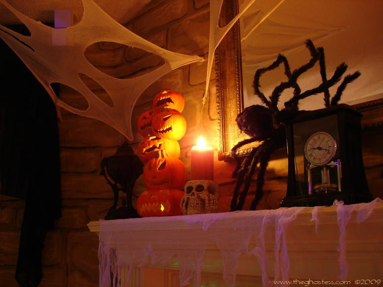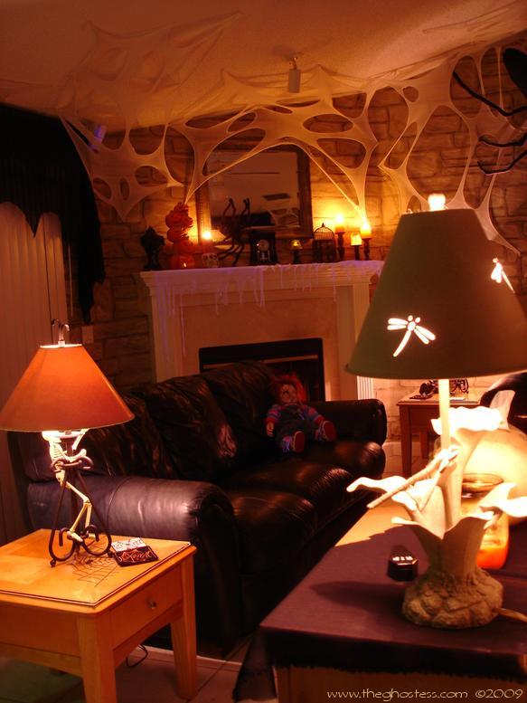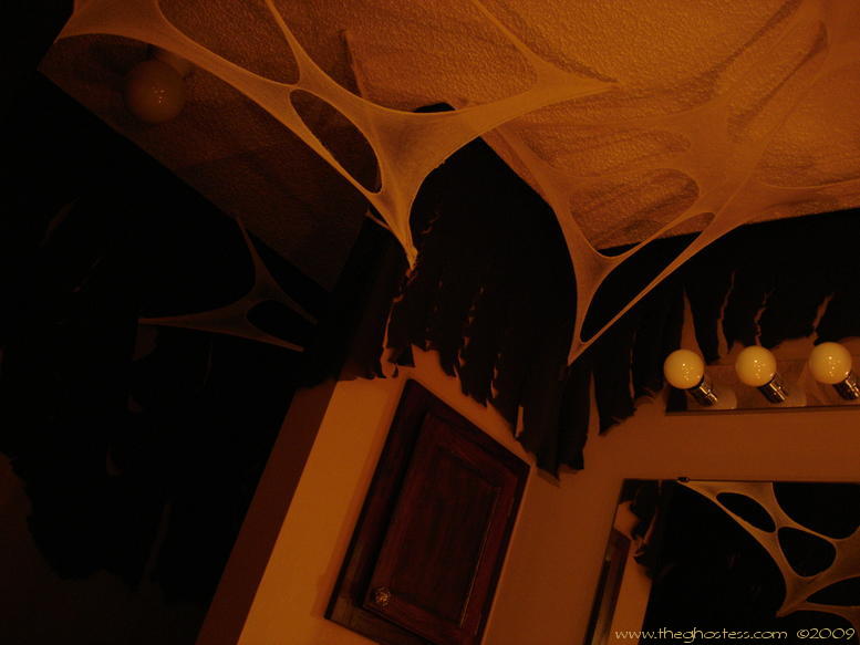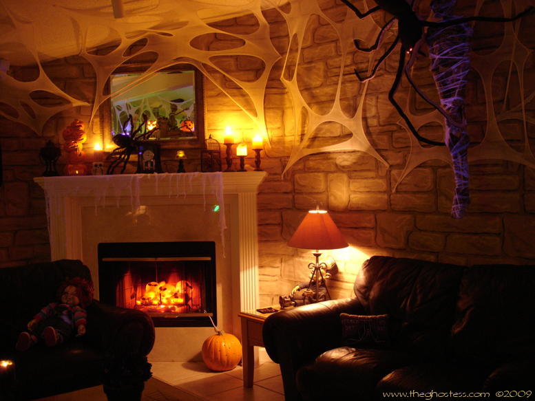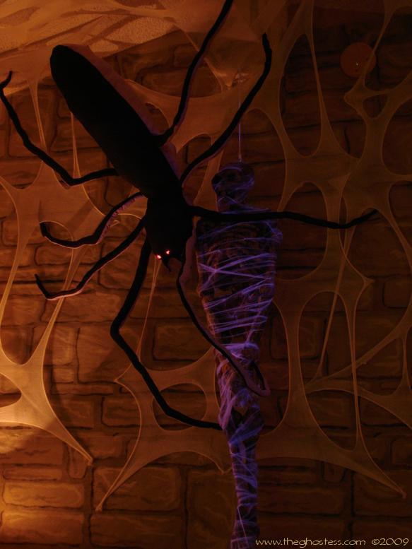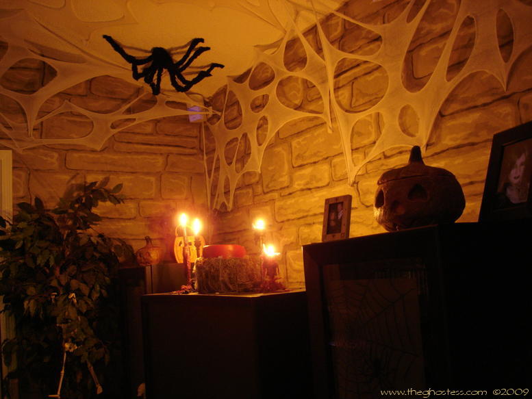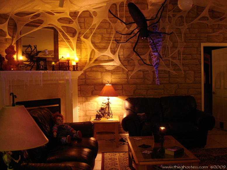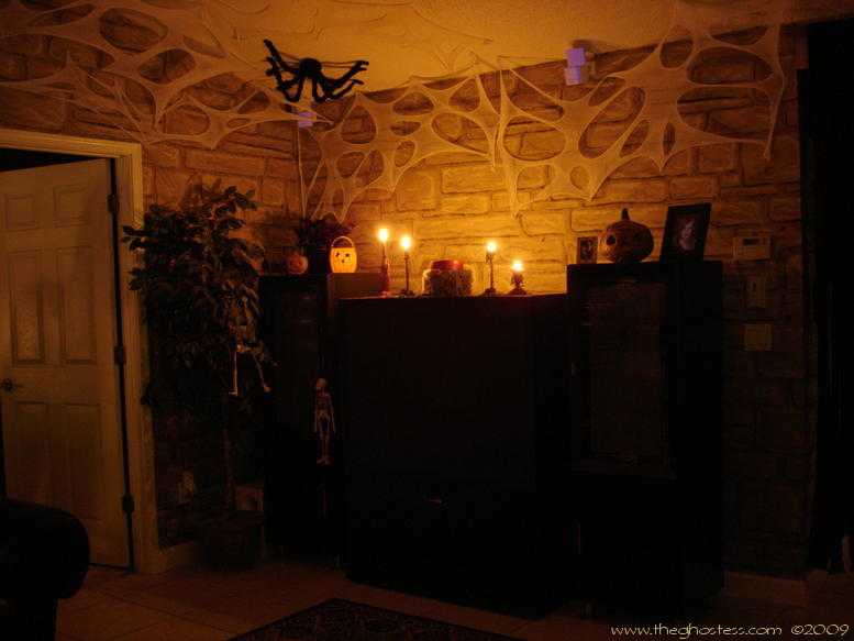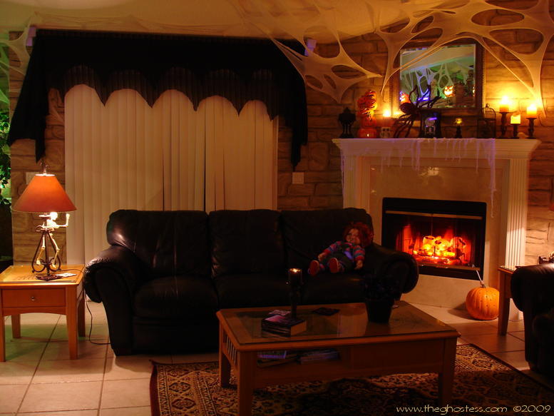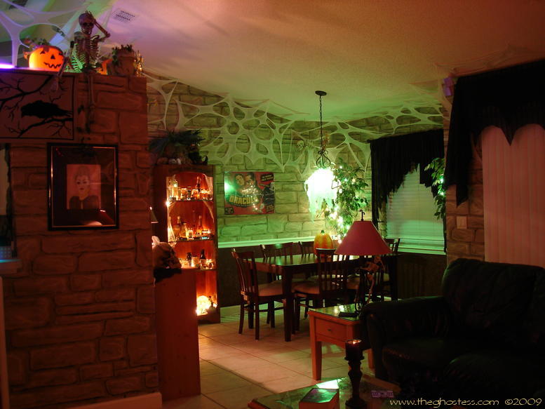 THE FAMILY ROOM Not a whole lot has changed in here this year either. I got a really nice table runner from our good friends Catherine and Darryl (thanks again!), and I didn't want it to get dirty by using it on the table, so I hung it like a banner over the bar. I LOVE it. The spider is the corpsed Blucky that I did. |