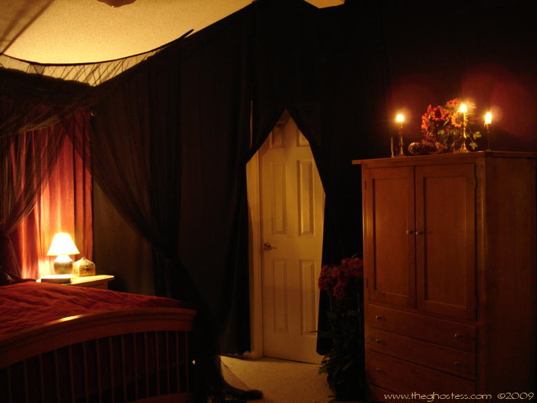 THE MASTER BEDROOM This year I went with the more dramatic black fabric on the walls of the bedroom. Other than that, not much else changed. |
