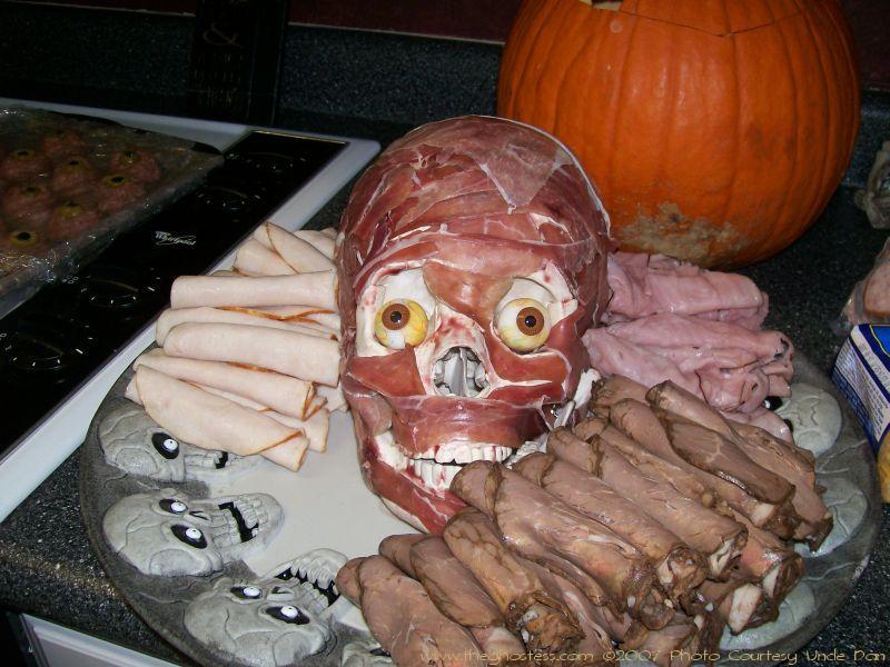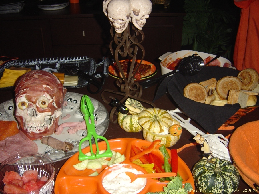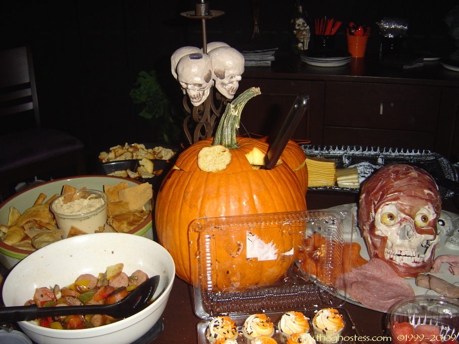 I use real pumpkins for serving bowls. I carve them out and make a little notch in the top for the spoon to sit. Then I wash and save them in the refrigerator, and carve them up for Jack O' Lanterns for Halloween. Ham Head is always popular, the key is using Prosciutto ham for that facial muscle look. This year I added a new dish that I've concocted this past month with peppers, mushrooms and smoked sausage. It was a big hit.