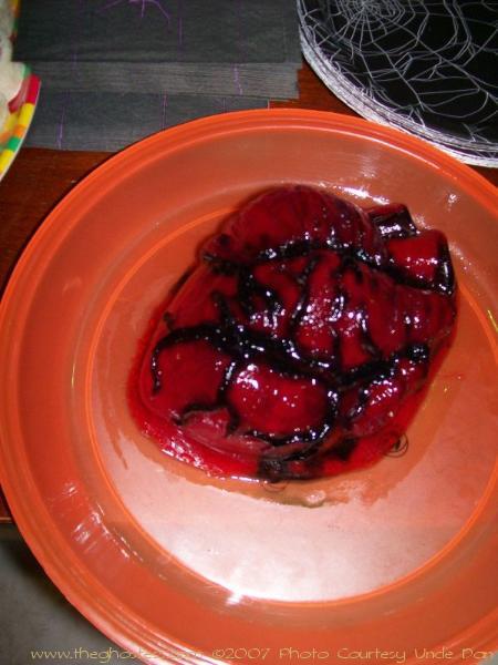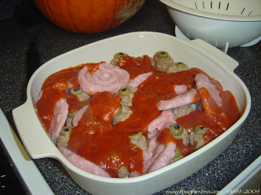 An awesomely disgusting recipe from Worldfamousrecipes.com, "Eyes and Ears". The eyes are turkey meatballs with olives, and the Ears are homemade pasta. We added some tongue shapes in for a little something different too.