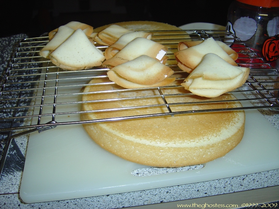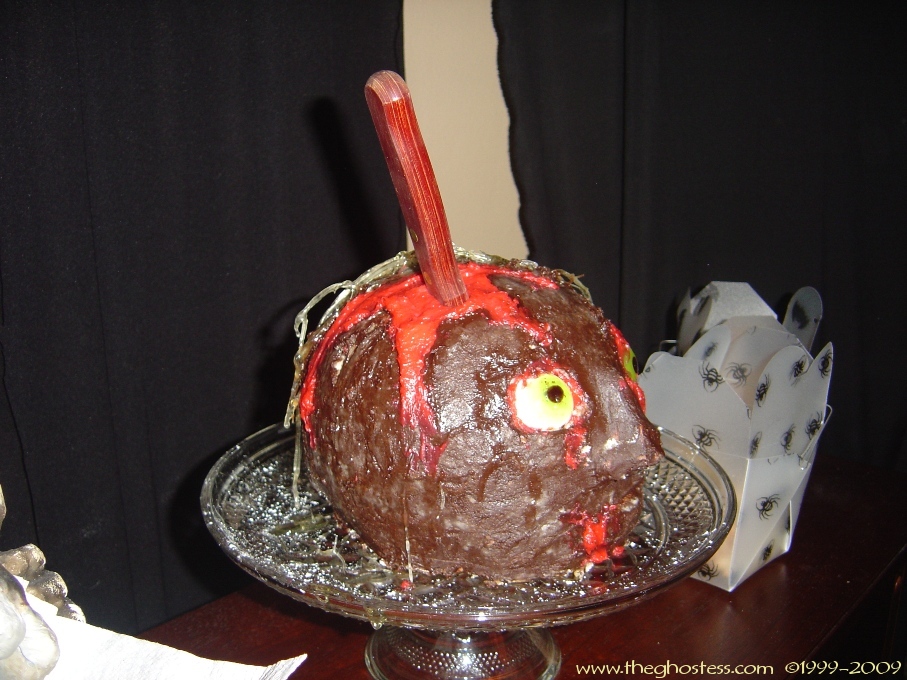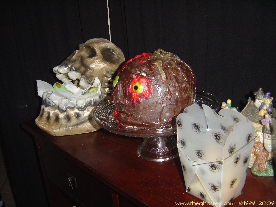 I made another zombie head from www.theyrecoming.com, but as usual, I ran out of time and had to throw it together really fast and sloppy. The first one I made 2 years ago was MUCH better. This one just got more blood and gummy eyes.. lol It was so humid that the hard candy hair I made melted onto the chocolate ganache. I made "Misfortune cookies" again too. Thanks to www.goblinville.com for that recipe, they're always a hit.