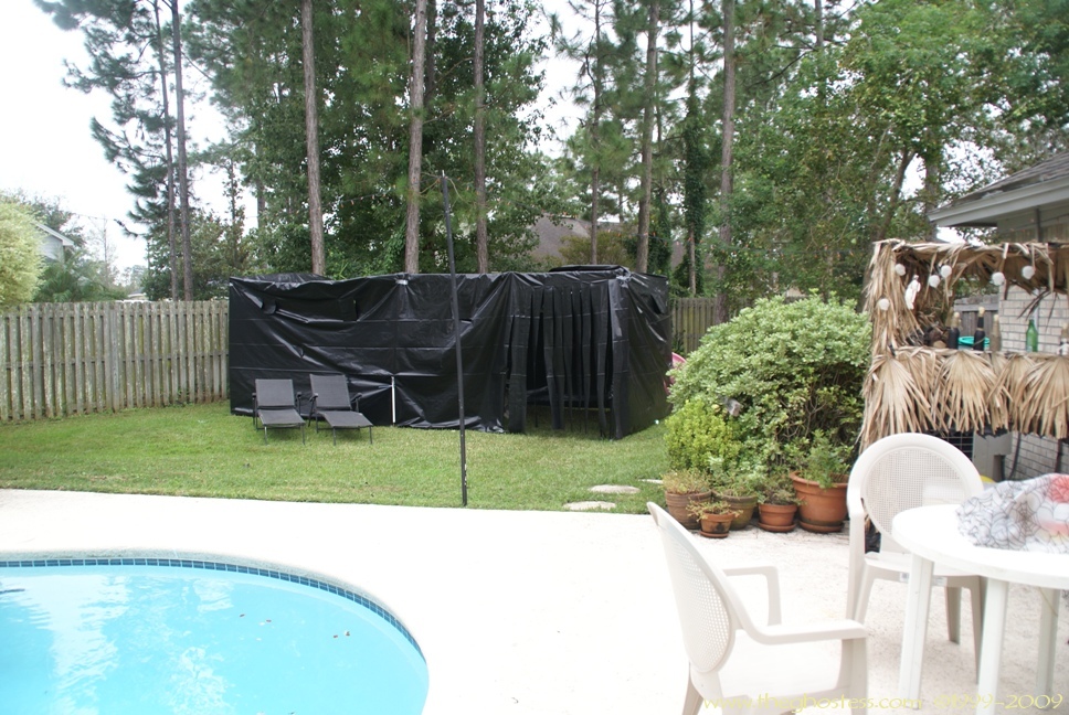 The tent above is the "under 12 years old" tent. You can see the muddy grass. It was soggy thanks to all the rain this month and there's a mud trail from there onto the pool deck and into the house. Below is the "older kids" tent. The rain didn't destroy it thanks to the 3 piece roof, but the wind took its toll. At least this one wasn't muddy like the other.