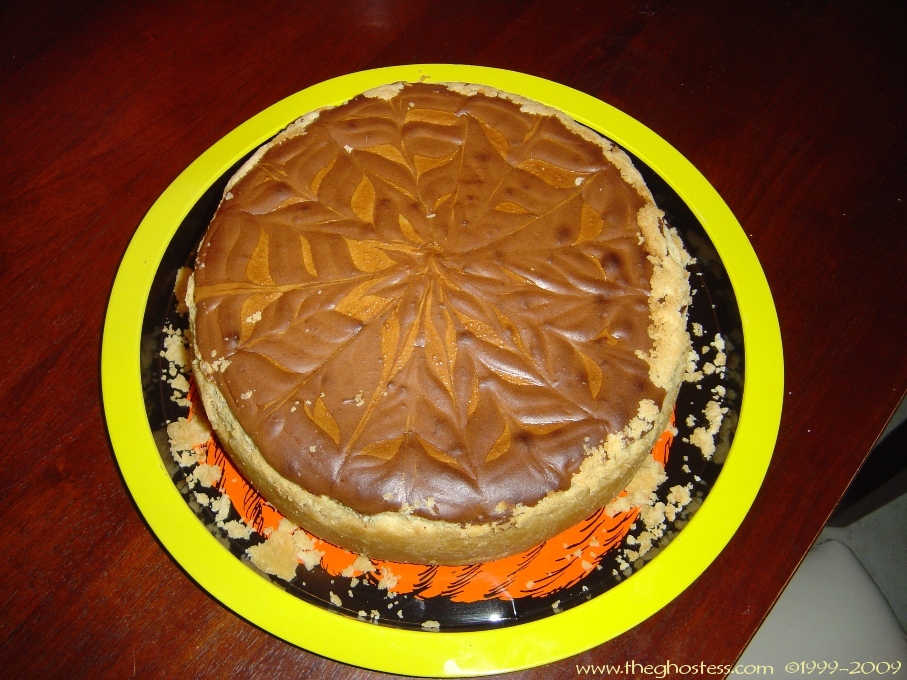 My homemade baked cheesecake. I swirl some chocolate on the top then run a knife through if to get the funky look. I put too much chocolate, it's supposed to look like a spider web. Last year's looked better.