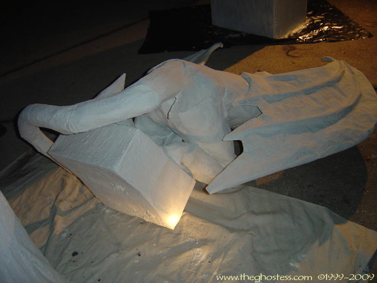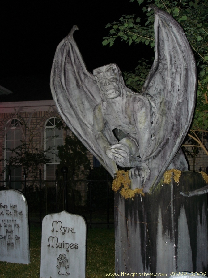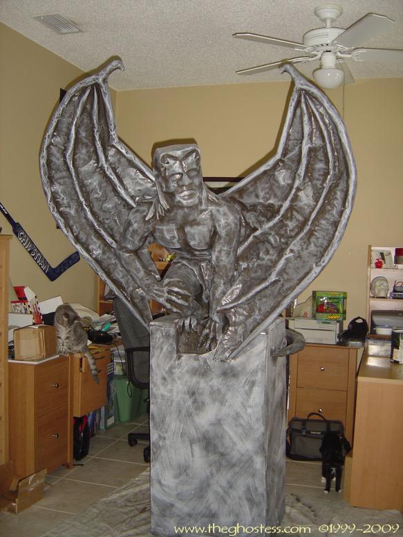 I decided it was time to finally give Goliath a better paint job and waterproof him with DryLok while I was at it. In 2006, I fashioned him a pedestal out of some scrap lumber and foam I had laying around and gave it a quick crappy paint job at 4PM on Halloween eve. Nothing like last minute spur-of-the-moment projects! Anyway, I took him apart, and coated the whole thing with 2 coats of DryLok Masonry Waterproofer. He was good and solid feeling after that. Then I painted him a base black. On top of that, I painted him a medium gray. I have an automotive sprayer that I had for this. (Makes life so much easier!) I gave him an aged look by brushing some black paint on in spots like you would see on old stuff that's been outside for a long time, then I sprayed that with a mist of water and watched it run. This gave a real mildewed and rained on look. After working on this for about 2 hours, I decided to go with some olive green for some mold here and there. I just dabbed it on here and there, not much, then sprayed with the water bottle to get it to run and look natural. This is something that has to be worked with a few times to get it to look right. That's about it! He'll be getting rebuilt somewhat though, because he got pretty dinged up while being transported to my son's middle school, and thanks to lots of wind and rain in the 2 weeks prior to Halloween.
