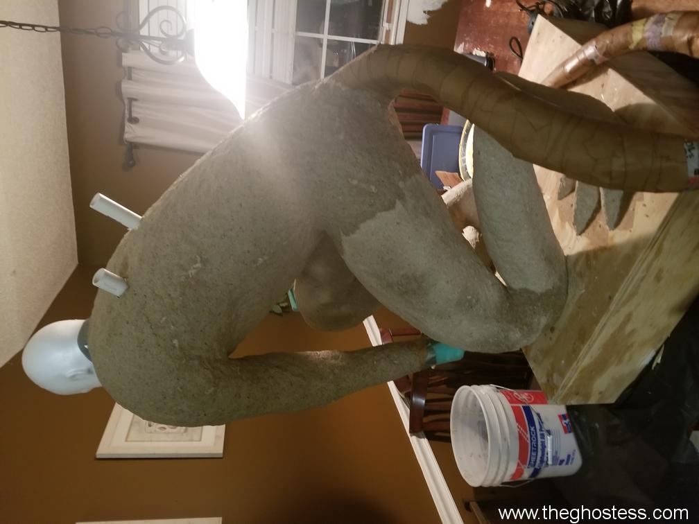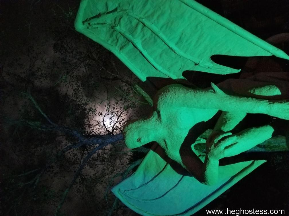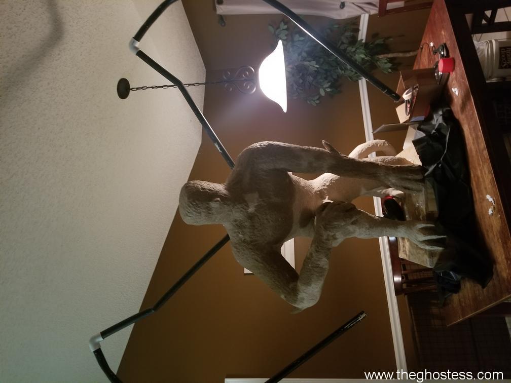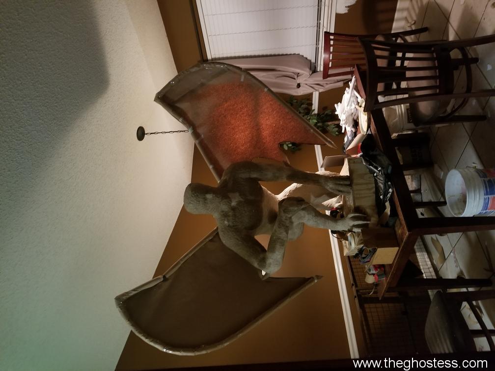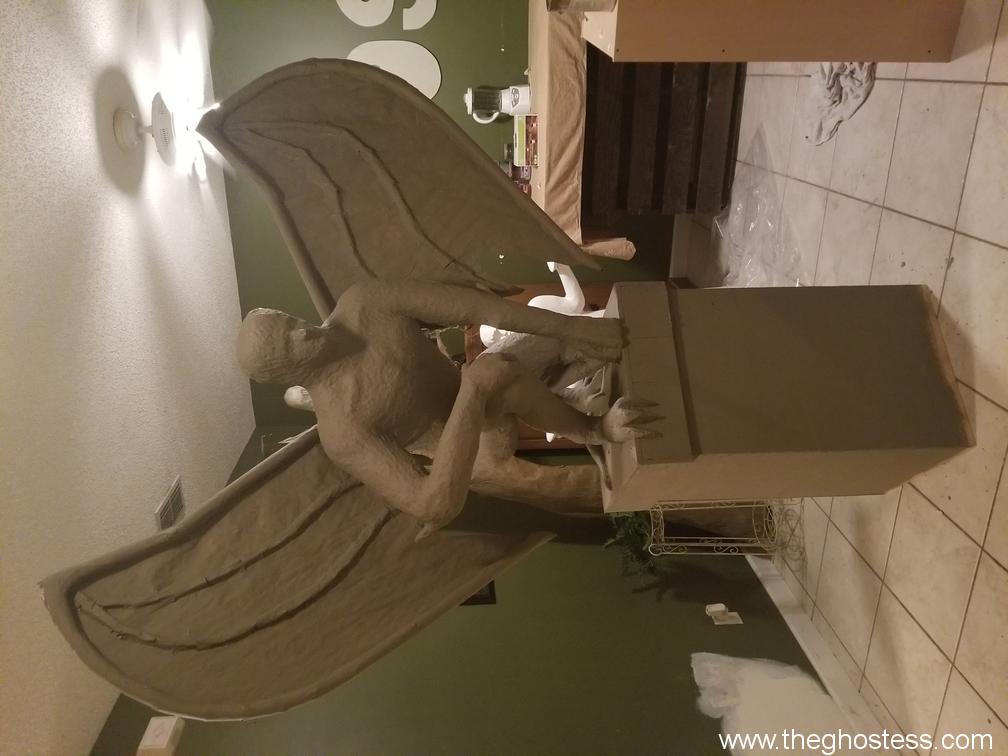 Ocotber 30, 2020 Only one day left, and I am stressing. I have to work tomorrow, and haven't finished setting up my cemetery display, so I can't work on him and finish him. I built a base out of plywood and 2x4s. It's a 3 foot tall base that his build base sits right over the top of. My good friend Elizabeth came down from North Carolina, and helped me with the painting. I had to stop working on him and get a coat of paint on him so he could make it out to the display. I think we got done just before midnight. He was not easy to paint with all the uneven surface and wings.