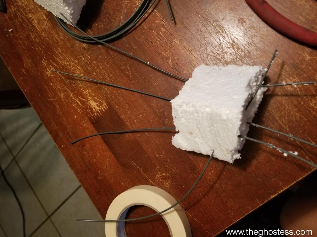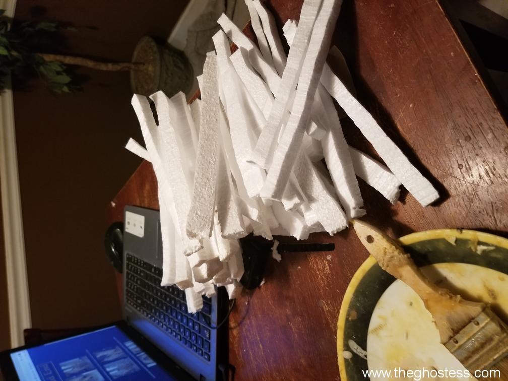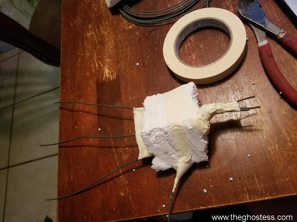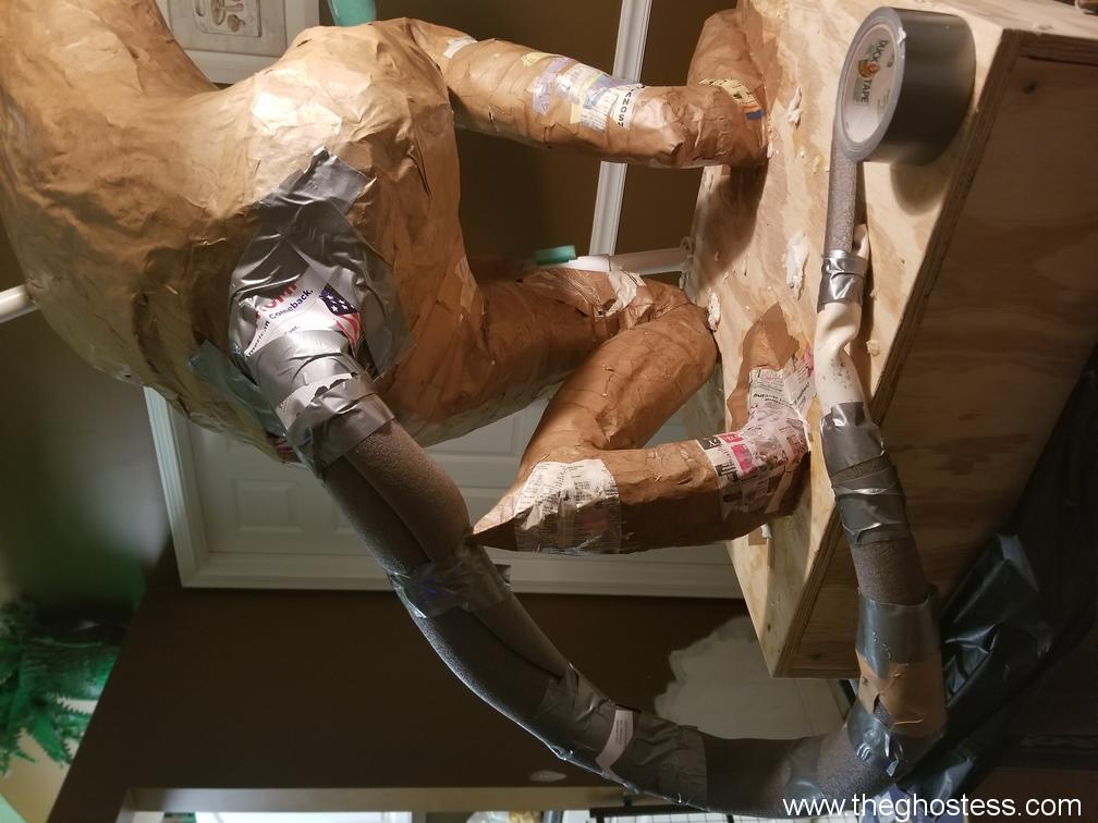 October 28, 2020 I used kraft paper for the flesh of the wings. I just cut long pieces and held them over the PVC and taped them on, then cut the bottoms to the shape I wanted. I am not super happy with the shape or position of these wings. but right now I am leaving them alone because I just don't have time to start over on them. I used my hot wire foam cutter to cut some strips of scrap styrofoam for the "bones" in the wings. Ocotber 29, 3030 I used paper strips to hold them on. Then I papered over the fronts and edges of the wings to thicken them and hold everything together. |