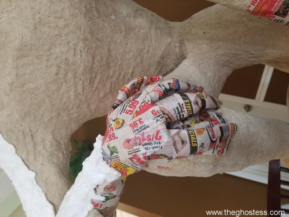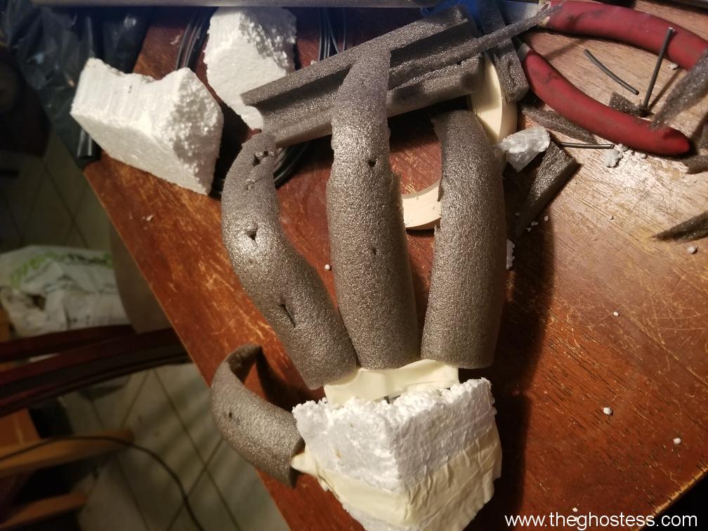 Ocotber 23, 2020 Even more paper clay. I also fashioned some crude hands out of wire, styrofoam and insulation foam tubes I had left over from another project. These are not the best hands I've ever made, but they will be covered in paper and paper clay, so they will get better. (I hope) The one that is on the straight arm will not get fingers as it will be in a fist, so it doesn't need to be totally hand-shaped. |
