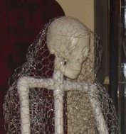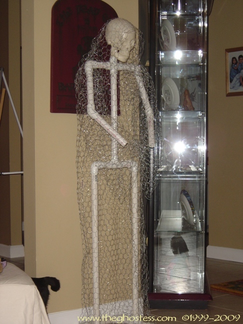 I didn't take any pictures of the placement of the sheets... so I went back and just took a couple of pics of how I attached the pieces of sheets. I cut a piece for the hood section that fit over the hood and inside the chicken wire behind the skull. Then I cut a long piece for the back and attached it up under the hood piece. I cut a piece for the front of the robe and attached it behind the sleeve section of chicken wire. Then I cut a smaller piece for the chest area, securing it under the hood and behind the sleeves of the chicken wire. I cut 2 long pieces for the sleeves, attaching then under the hood at the shoulder and wrapping them around the sleeve, securing them between the sleeve and body of the reaper. Last, I tucked the sheets up inside the sleeve of chicken wire.
