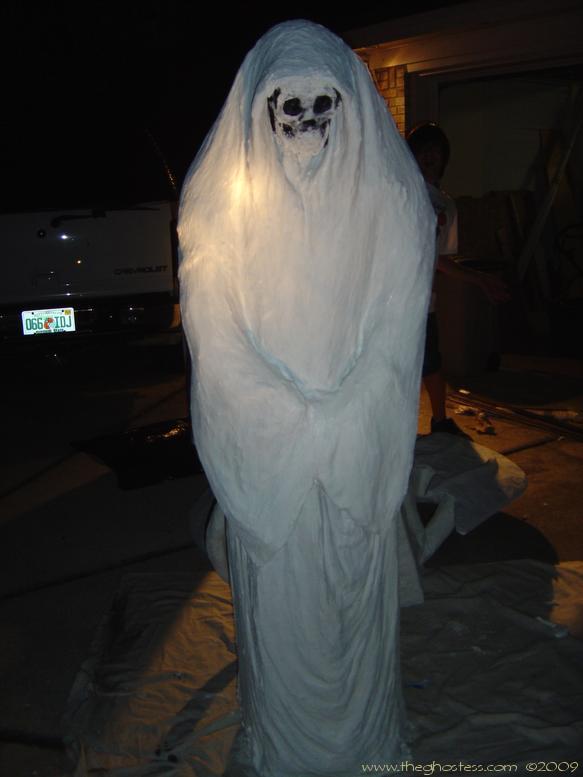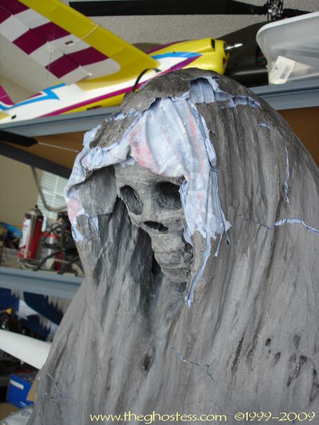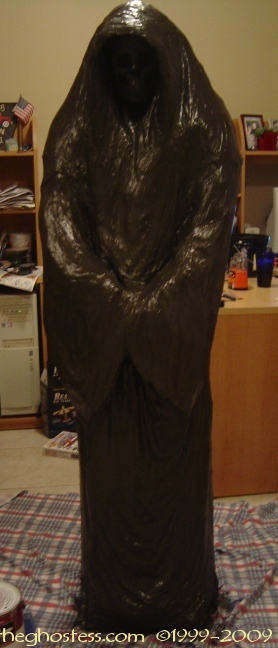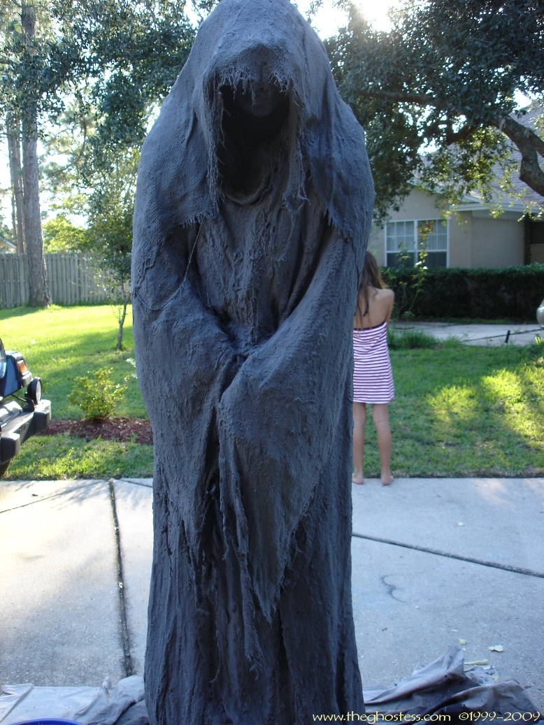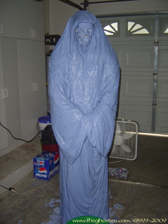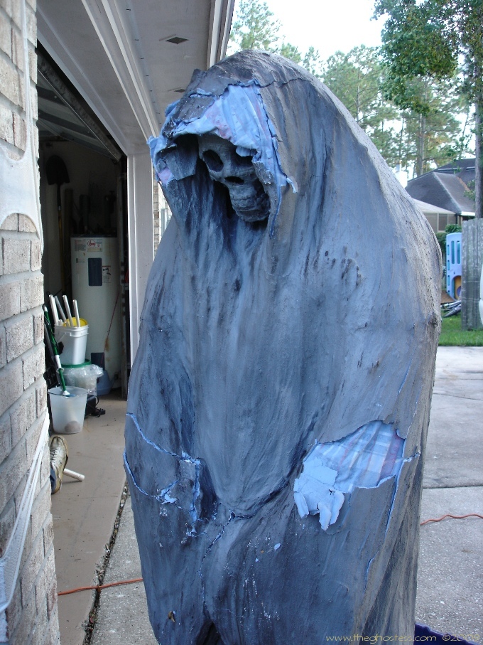 In the end, I ended up giving Grim 4 coats of monster mud and 4 coats of paint. I wanted to make sure he'd be solid for a long time to come. I think if I were to take out the PVC frame underneath, he's stand without it or the chicken wire! After I base coated him, I took a damp kitchen sponge and some light gray paint and just kind of ran the sponge downward in swift short strokes. The paint job didn't turn out like what was in my mind, but it'll work.