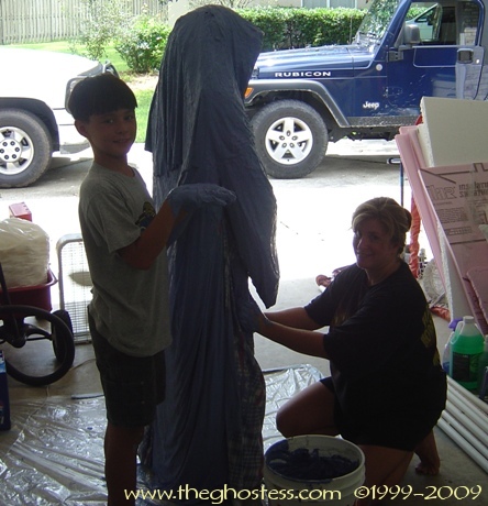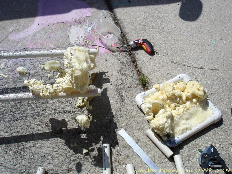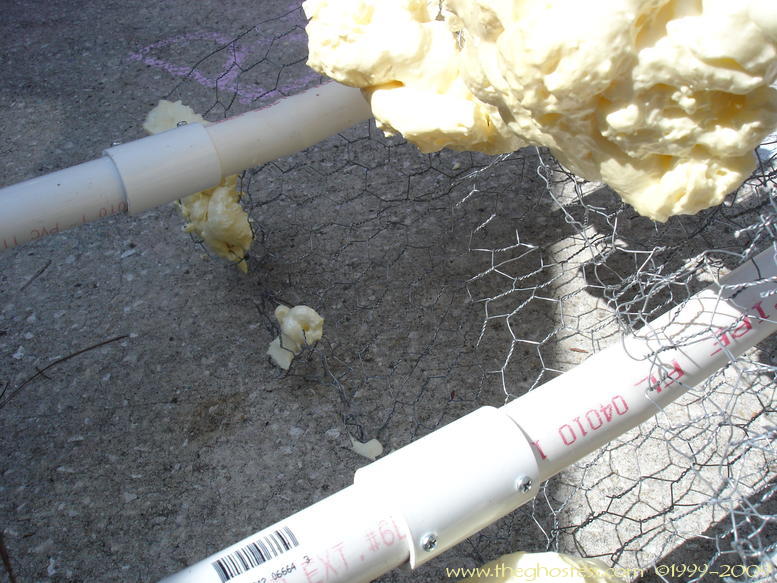 In 2008, Grim finally got his makeover. He also grew over a foot and got a more stable base. I started by stripping all the old mud and sheet. Then I cut the base off and added more PVC to the length of the "legs" of the frame.