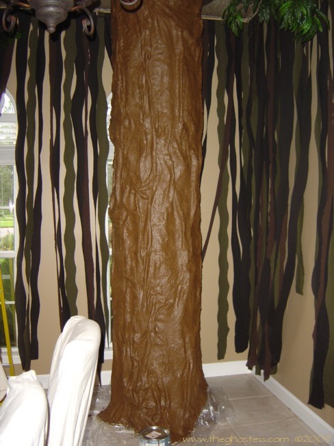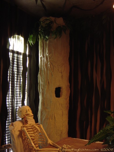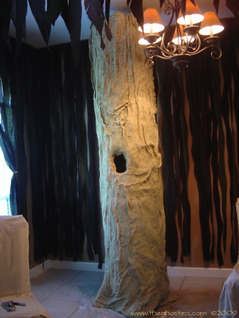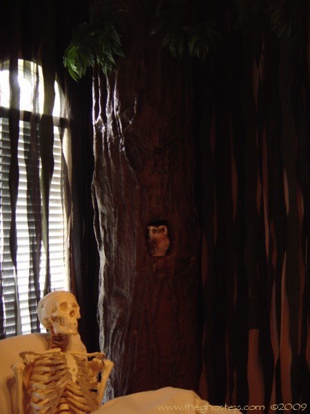 The owl may or may not be staying there in the tree, unless I decide to throw in some LEDs for the eyes and make him a perch to sit on inside the hole in the tree.  I'll be adding more foliage to the ceiling as it draws nearer to the party.  With all the trouble I went through to build this thing, I could have just waited and brought in one of the 4 trees that blew over from hurricane Frances.   |
