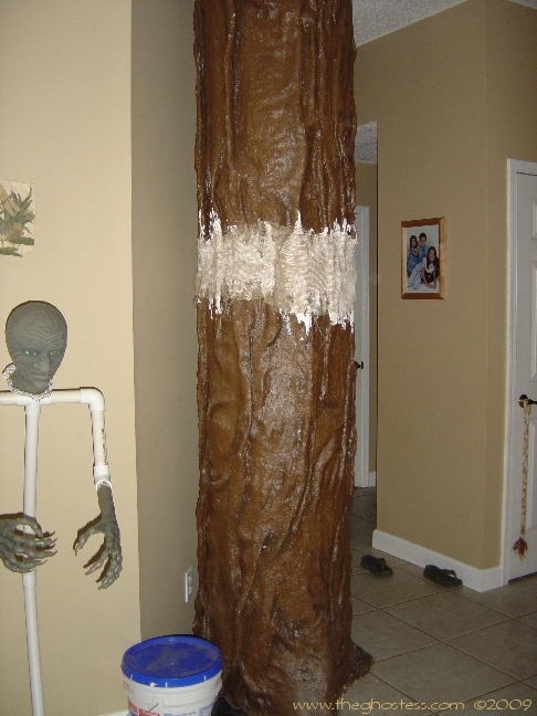 In September, I put the tree back together and brought it back in the house. I used some scrap pieces of burlap and just kind of patched them on the part I cut with some joint compound.  |