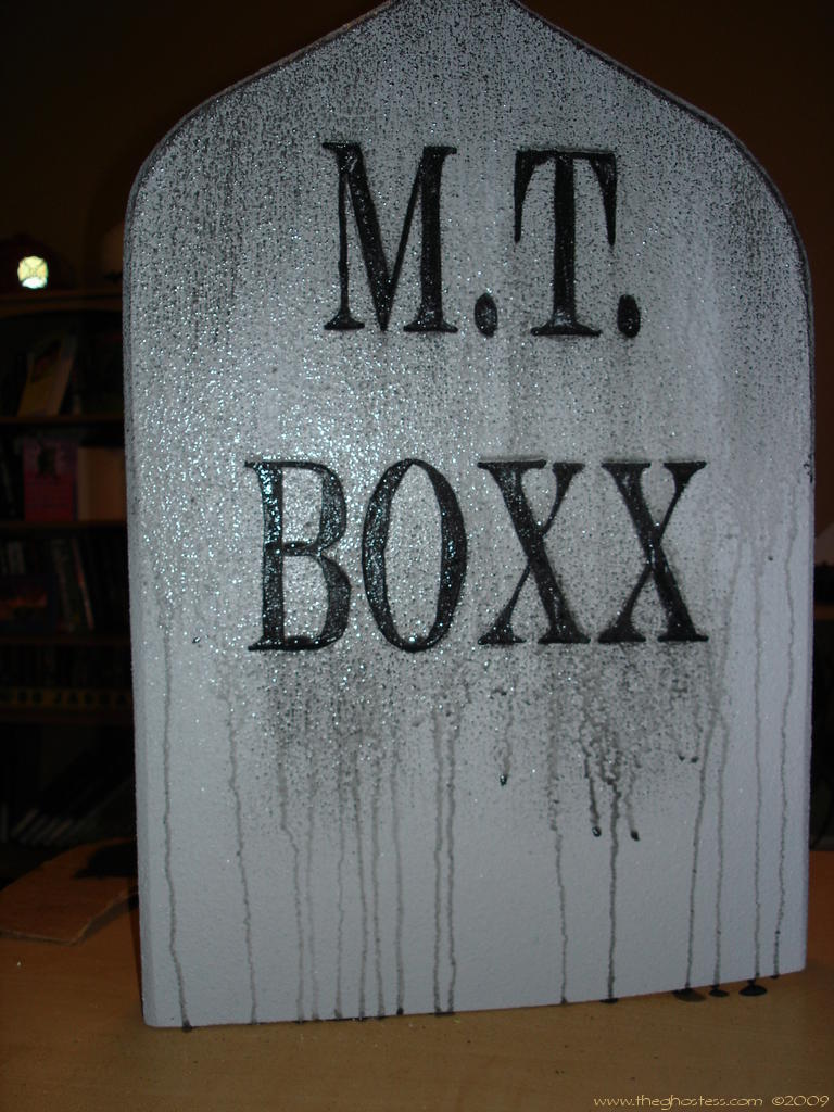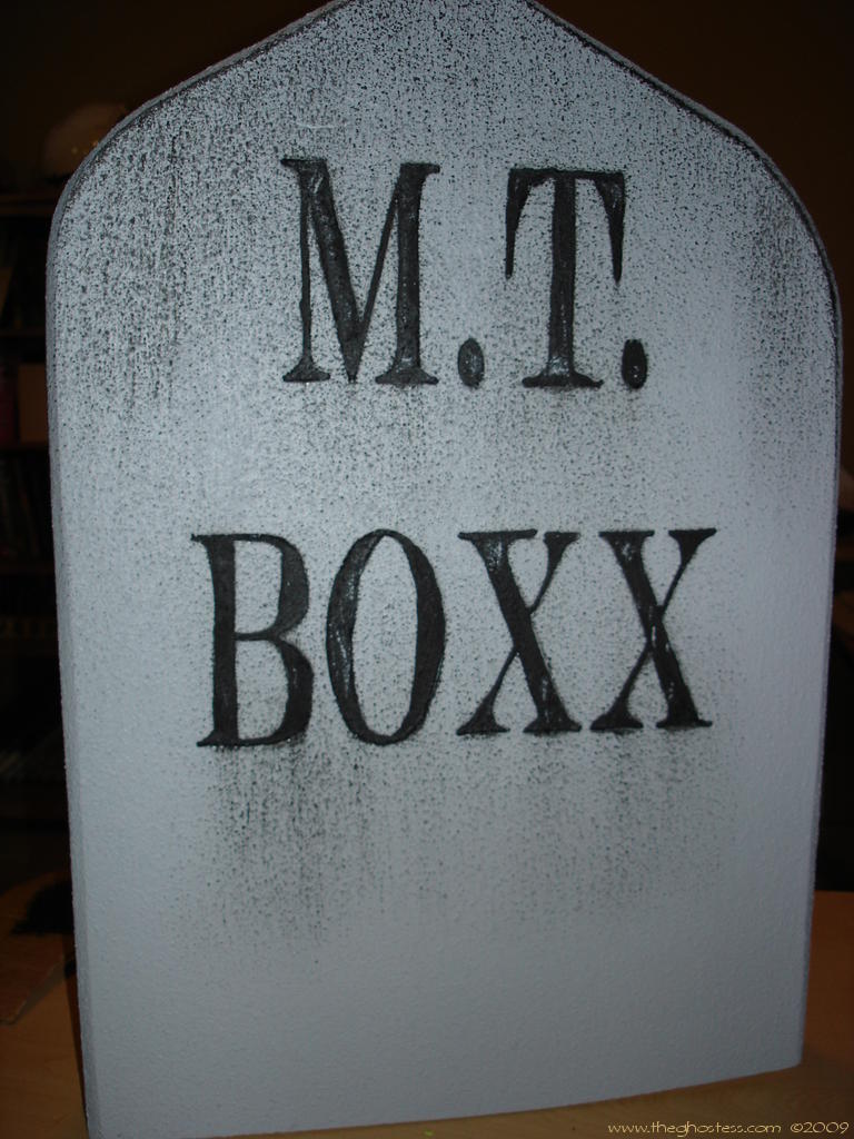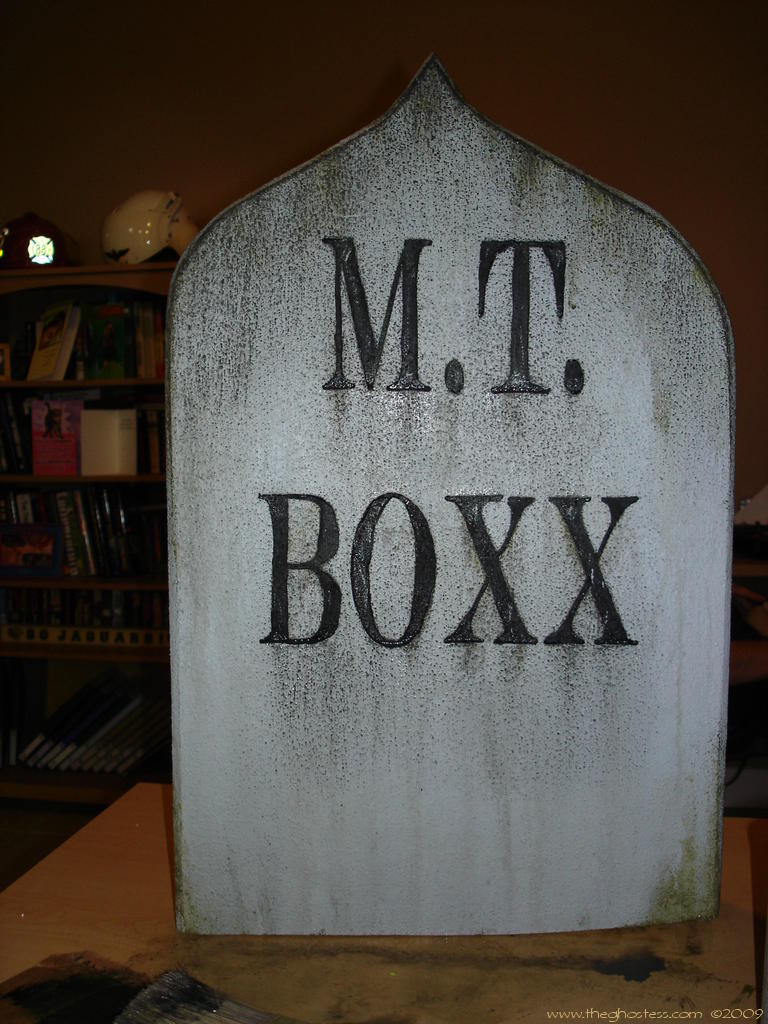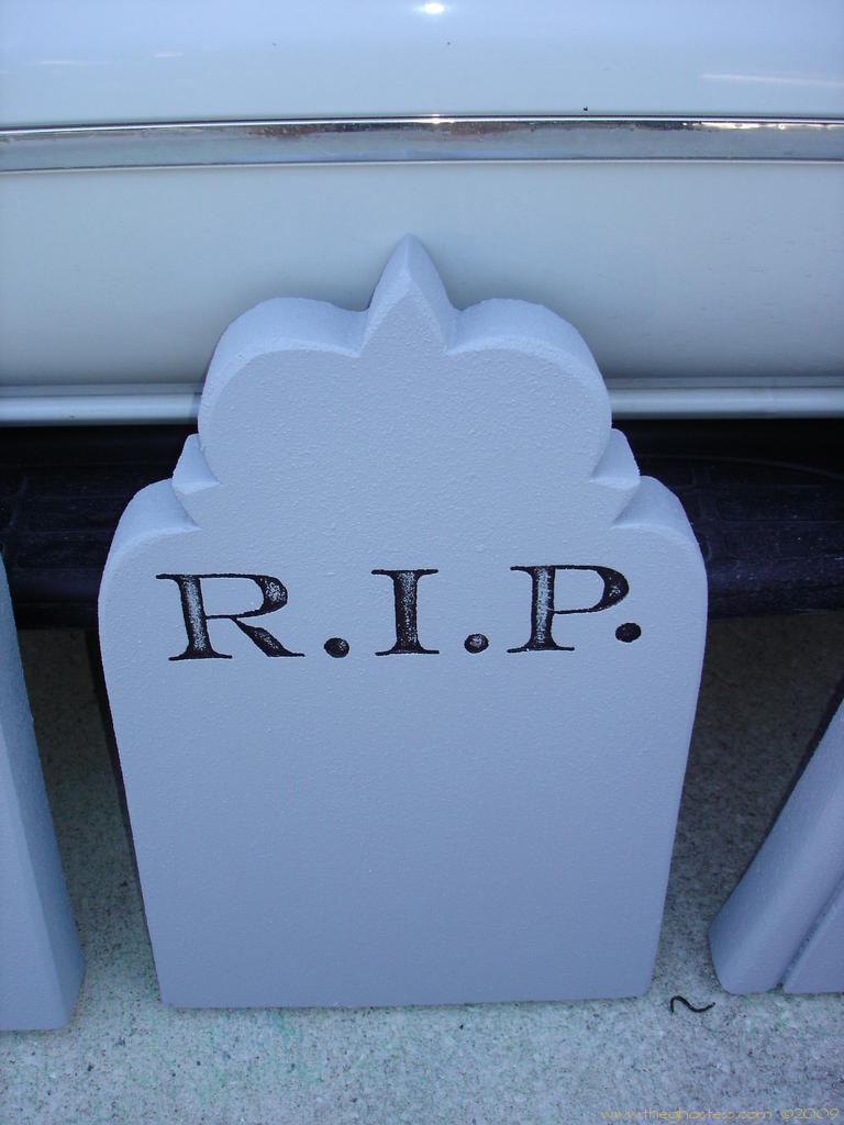 Now I use a spray bottle with water to help get that old dirty look. I spray the tombstone with a mist of water first. Then I take a stiff paint brush and dip it in the black paint and wipe off the excess on a scrap piece of cardboard (just like above). This time however, I run the paint brush down the whole tombstone. I spray over that very lightly with the water, and let it run, drip and dry. Then I repeat that process with some pea-green paint mixed with black paint. I do this only in some spots just to give it that mossy green staining that I've seen on some tombstones and statuary. Then I follow up with more black wherever I think it needs more or it ran too much before. This is where you just work with it until it looks good. It will need time to cure so that the paint doesn't wear off, so let them dry at least 24 hours before setting up in the yard. You can also add stuff with hot glue to your tombstones, like moss, to give it that creepy look. Anyway, there ya have it - the new and improved tombstones from The Dead End. As I learn new stuff, I'll add to the pages here. |