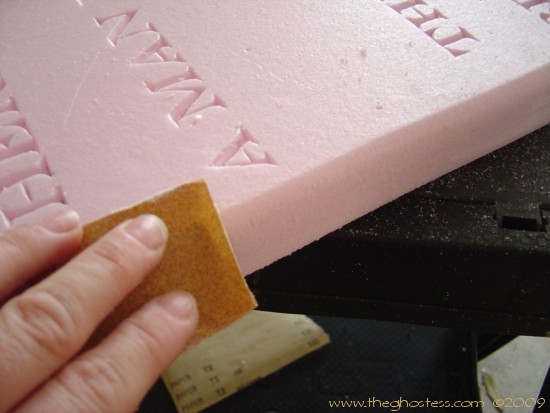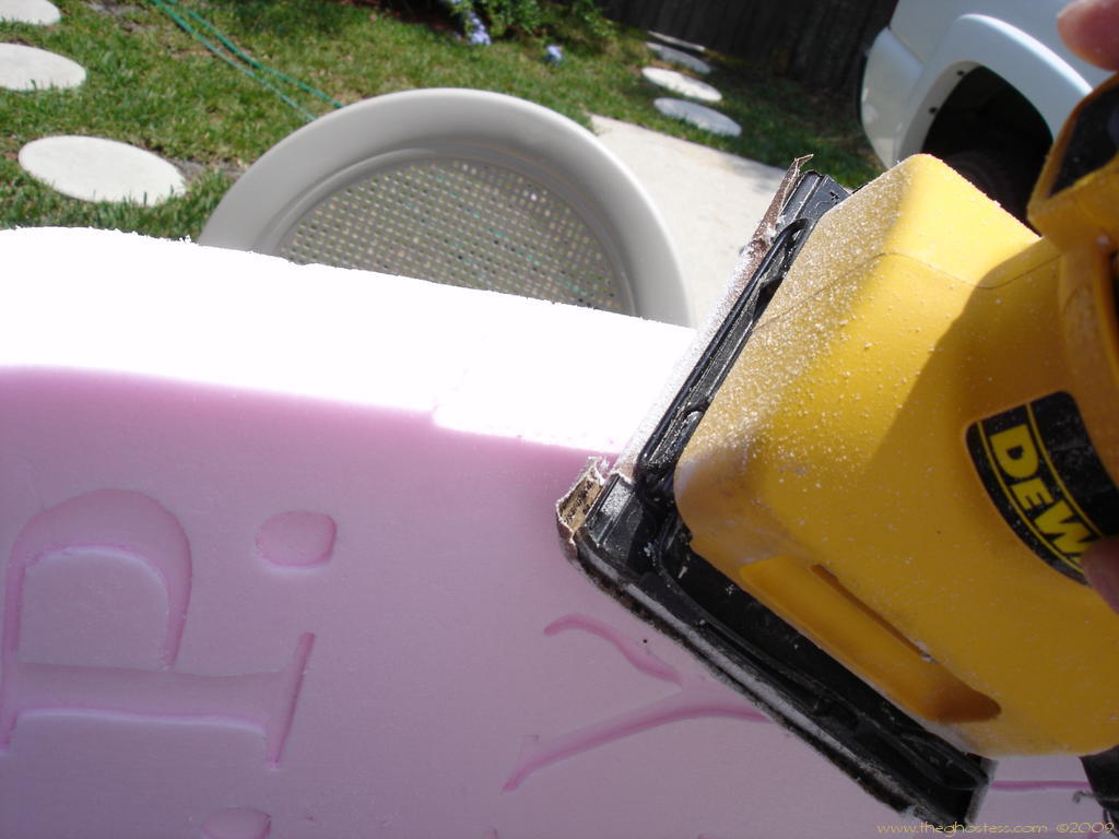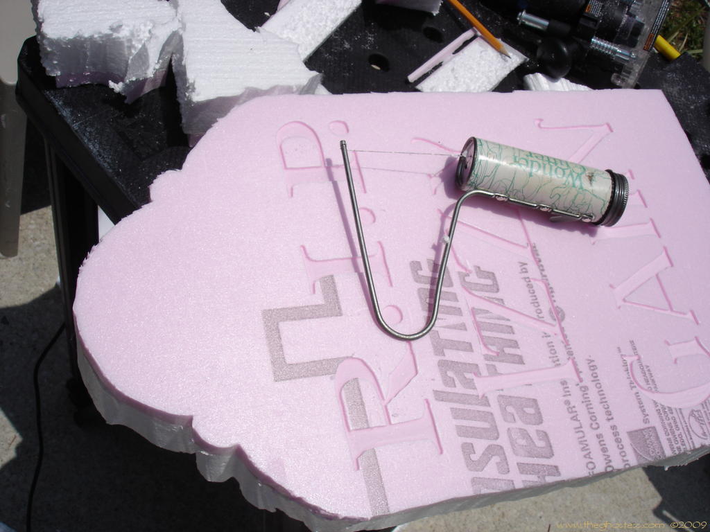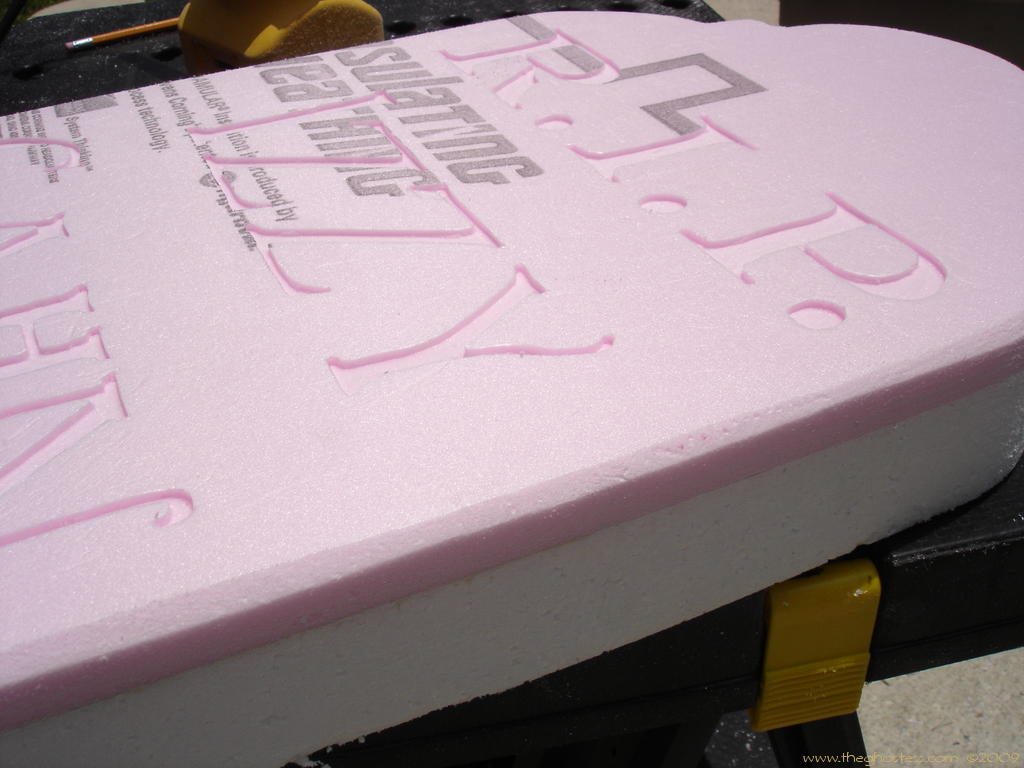 There are a number of ways you can carve the shape of your tombstones. You can use a really sharp knife, a drywall or hack saw or even a jigsaw. Or you can use a hot wire foam cutter. You can buy a battery operated one called a WonderCutter from Michael's Craft Stores for about 8 bucks. You can buy plug in types from other places like the Hot Wire Foam Factory... or you can make one yourself. I recently made one myself using Wolfstone's instructions and I LOVE it. Before, I was just using the battery operated one. The wire gets heated by the power source and glides through the foam like a knife through butter.