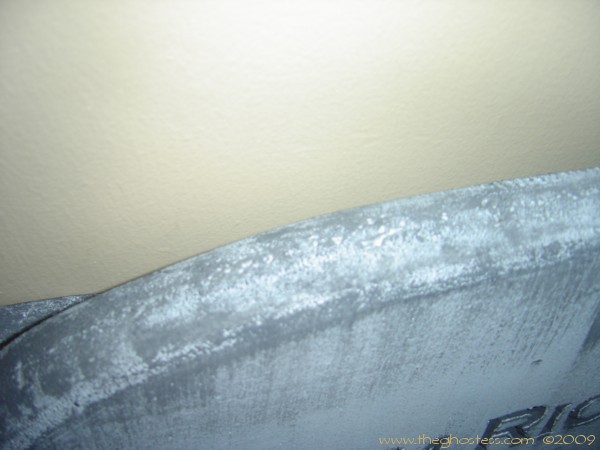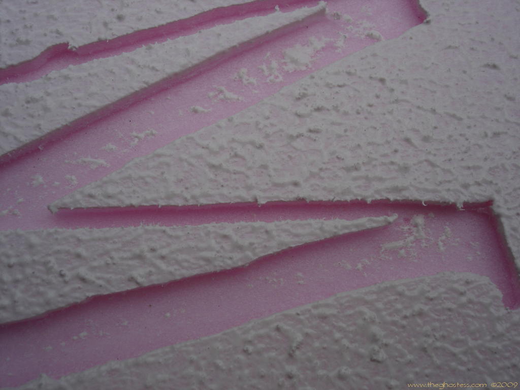 I like my tombstones to have a stony texture, so I tend to use DryLok (because I have a gallon of it sitting there) on them. It's not necessary for waterproofing purposes on tombstones. I've also used regular latex paint with play sand in it to paint tombstones with. If you buy your paint at Home Depot, they usually have a section where they mix the paint that has the "Oops!" paint. This is paint that wasn't tinted correctly or that the customer either refused or brought back. It's usually a buck for a quart or 5 bucks for a gallon. I ALWAYS check this section for gray paint every time I go in there. All my tombstones and most of my other props have all been painted with Oops paint. You do not want to use enamel spray paint on your naked foam tombstones. The solvent in it will eat the foam. If you do use a spray paint, make sure to either use one that is latex based or that you coat your foam with latex paint before you use the spray paint. Again, you don't want to do all this work, then go to paint and it eats all that hard work right up! If you are using DryLok or sand in your paint, you might want to give it a coat of that before you paint your lettering. I use a small foam roller to do my painting, that way it goes right over the letters without getting paint down into them. The larger fluffy rollers will tend to push paint down into the carving, and you can also see the texture DryLok gives - see below: |