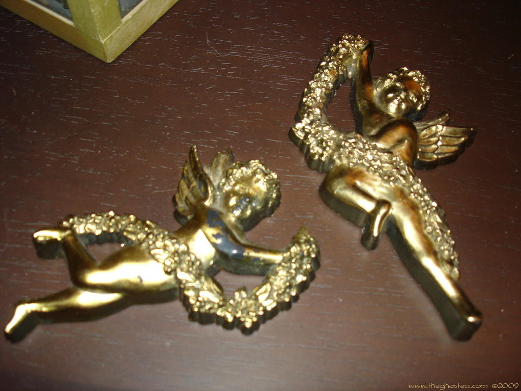 Because I'm a psychotic OCD perfectionist type, I like to fill in all the gaps where the two foams are glued together. I just use joint compound and a plastic putty knife to do this. It's not a necessary step, but I like to do it anyway. I sand it smooth when it's dry. You can also add other things to your tombstones for some extra pizazz and character. Skulls, bones, crosses, even Xmas ornaments can be glued to the foam and painted over to look like it is part of the tombstone. I'll be experimenting with this in the 2008 preseason this year. Most plastic things can be cut in half to glue on to the foam, plaster of paris can be ground with a bench grinder. I found some fun things at the thrift store to add on: These little angels on the left will go nicely on a tombstone. They're already flat and ready to be added. The little cherub to the right will go on top of a monument of some sort I think. I also found this neat little box thing that I'll be taking apart to use the acorn and leaf pieces for tombstones.