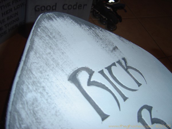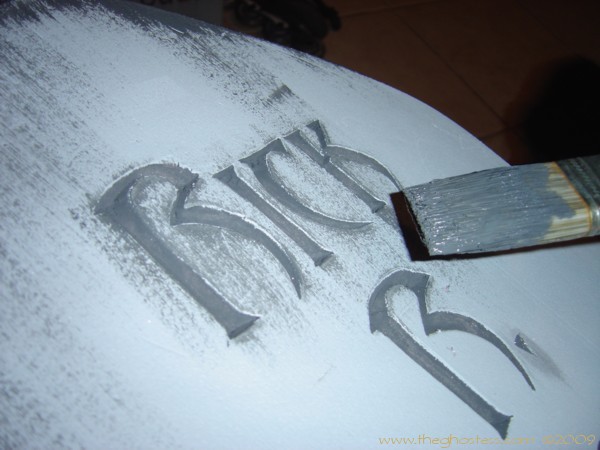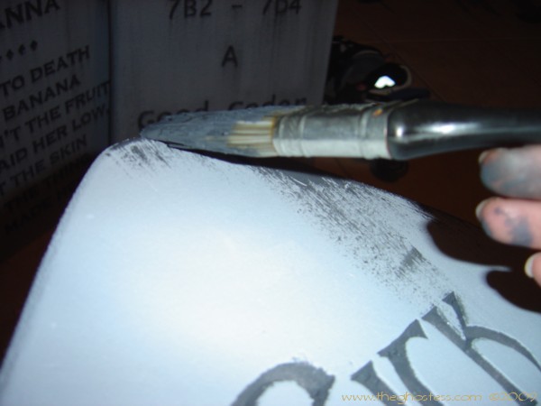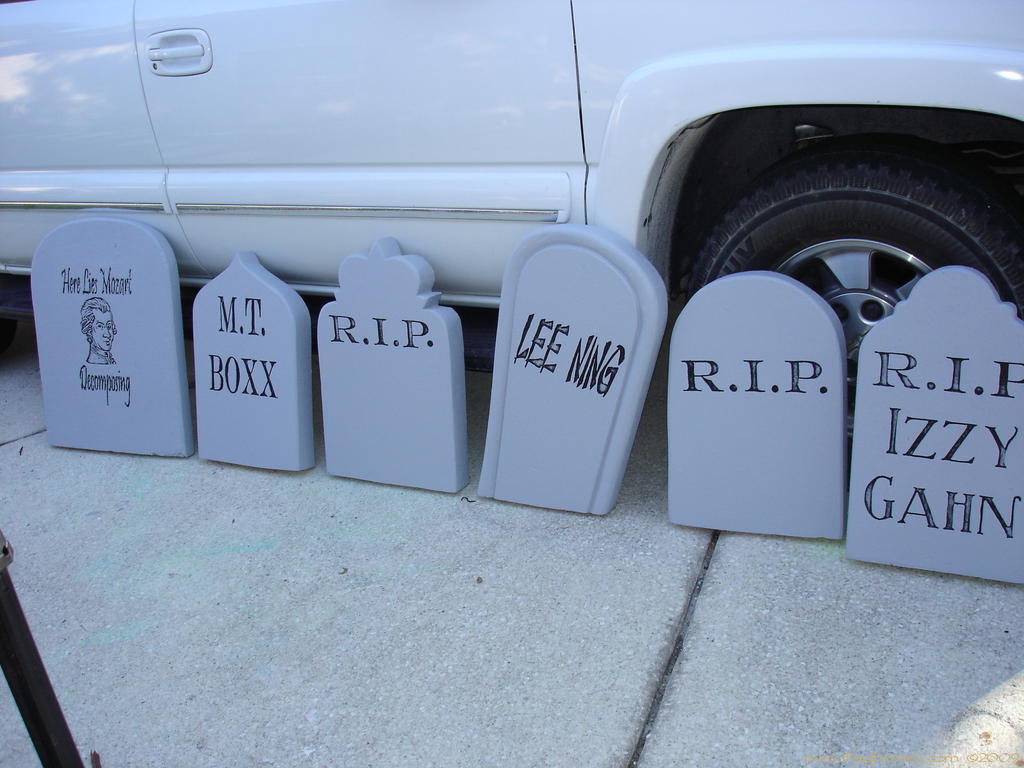 I use a small chip brush to fill in my lettering. It doesn't have to be pretty, just filled in completely. *note: Fellow Florida Haunter, Coda180, uses a squeeze ketchup bottle filled with paint to squeeze the paint into the letters, then he reclaims the excess. Great idea! Then roll over the whole thing with whatever color you want them to be. Again, I use a small foam roller for this. Slave labor is good for base coat painting too, as shown below: I usually give 2 coats of color on my tombstones. Since I'm using sand in my paint, my tombstones are heavier and more durable than if I were just using the paint by itself. If you try the sand, just don't use TOO much sand in it, otherwise it likes to "pill" up while you're painting. The great thing is, that when you finish rolling your color on, you can go back with a really small artist's brush and touch up the black lettering pretty quickly. Another even faster way to paint large groups of tombstones is to use a sprayer. We have a touch-up sprayer and a Husky HVLP gravity feed sprayer. I've only used the touch-up sprayer, but I can tell you that for the 12 bucks spent at Harbor Freight for it, that was money VERY well spent. I mixed my paint with an equal part water and painted several large props. This would work well for tombstones too, for base coats. Then you could just paint in your lettering later. If you have an airbrush, you could also do your aging and detail work with that. |