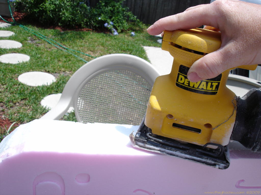 So, now that you've got your foam cutting method, just follow your lines and cut away. I use a box cutter to score and snap off the bigger pieces like corners so that I have less work to do with the foam cutter. I don't spend much time trying to be perfect when I am cutting the shape because the next step takes care of all that for me. I sand the edges of my tombstones, rounding them, bevelling them, making them smooth. I used to do this by hand, but now I just use my orbital palm sander. I also sand the backs of the tombstones on the white styrofoam, but that's just an added step that you don't really need. I just like to. :) If you tilt the sander 45°, you will get a nice beveled edge. |