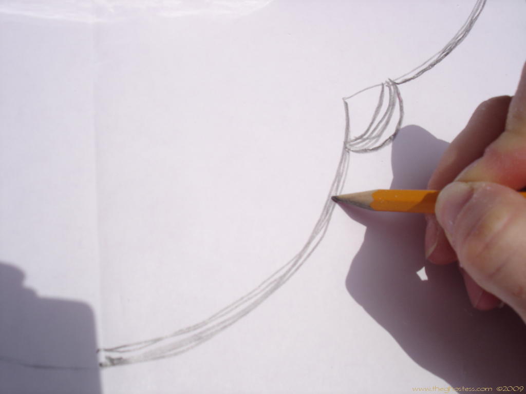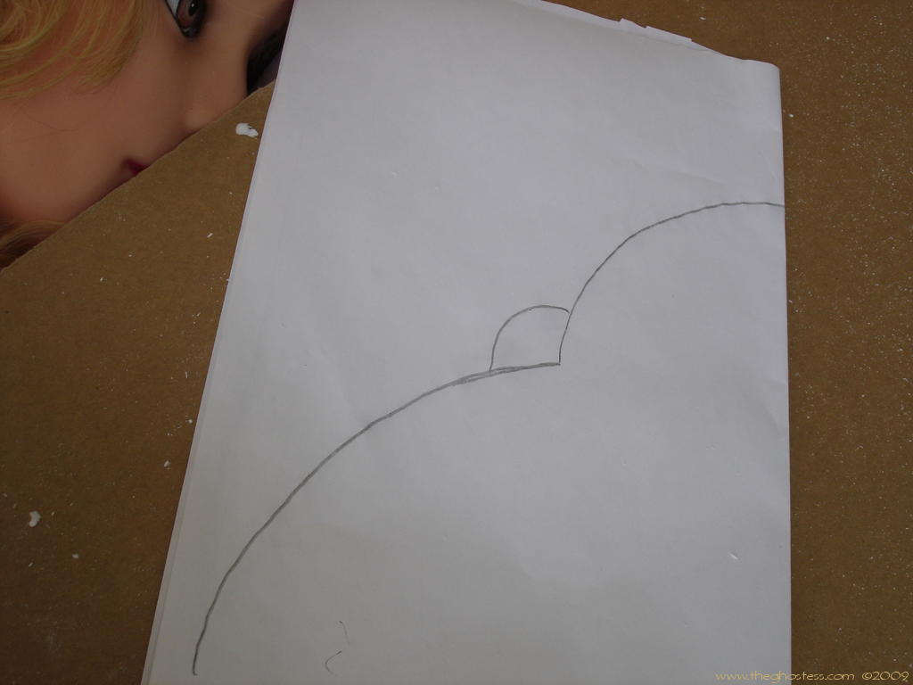 Moving on to shaping... I found the easiest way for me to make the basic shapes for my tombstones is to use the old "fold and trace" method I learned in elementary school. I sketched out the shape I liked, trying to stay within the size confines of my rough cuts of each tombstone I have ready for shaping. I then fold over that sketch, so that the fold is right down what will be the middle of the tombstone. Then I trace the line through the paper so that it transfers onto the other side of the template. Now I have a symmetrical shape for the top of my tombstone. I place the paper over the rough tombstone, trying to make sure I have it centered over the epitaph. There's other ways to make a template, or you can just wing it and do it by hand. Once I have it placed where I want it, I use a pencil and trace the drawing I made and make sure to put enough pressure that it goes all the way through to the foam to create lines. |