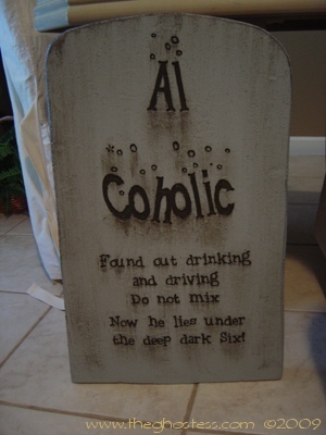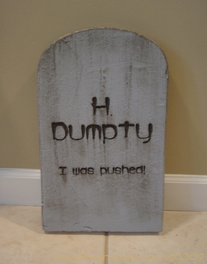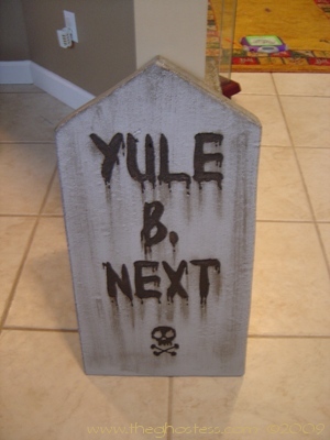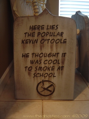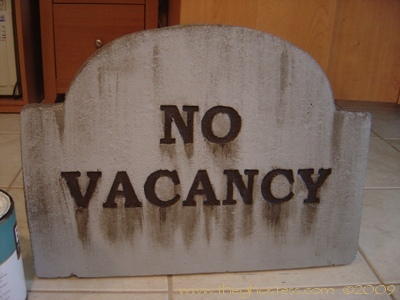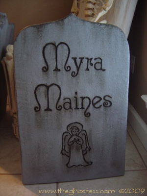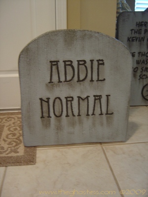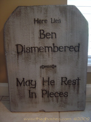 I decided I needed more tombstones this year, so I went to work making them in late July. This time, I used the beaded Styrofoam that comes in 4'X8'X2" sheets from Home Depot. It was not TOO difficult to work with, although there were some problems with the Dremel catching the beads and tearing when I tried to do small detail work. The painting was somewhat tedious, but mainly because it took so much paint to cover them and get into the small nooks and crannies that come with Styrofoam. I cut them with a utility knife and a Wondercutter, and sanded them with a palm sander to smooth them out some. (after sanding about 6 of them by hand!) The rest of the process was about the same as the tombstones that I did last year with the pink insulating foam. They look ALMOST as good as last year's, but cost half as much to make. |